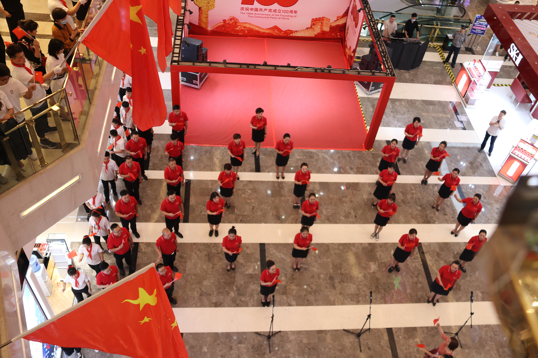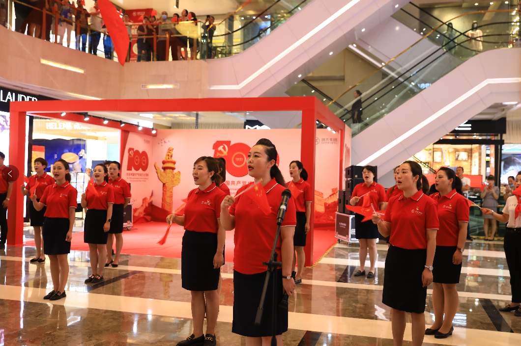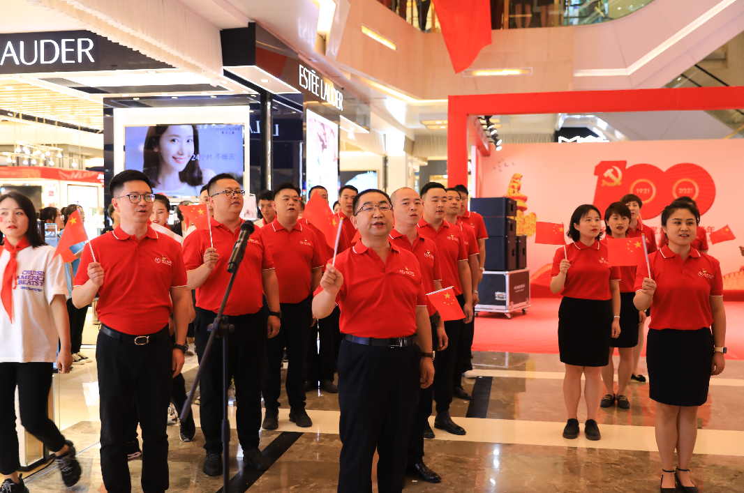 下午14时,云顶国际集团庆祝中国共产党成立100周年红歌快闪活动在兰州云顶国际百货广场店一楼中厅隆重举行。云顶国际集团全体党员及员工代表参与其中,大家用歌声表达对党的无限忠诚和美好祝福。
