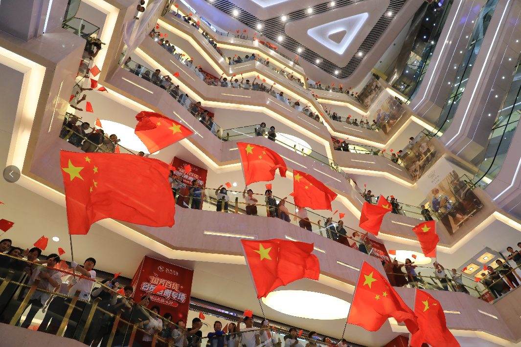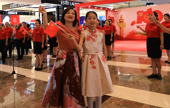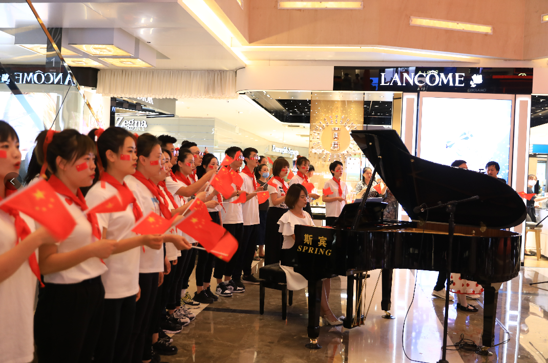云顶国际百货中厅,随着钢琴声响起,活动在男、女领唱“歌唱我们亲爱的祖国,从此走上繁荣富强”的歌声中拉开了活动的序幕,30余名云顶国际集团党员及员工代表缓缓向主舞台走来,大家手持国旗,组合成“100”字样,神采奕奕,高声齐唱。与此同时,现场的围观顾客也纷纷加入到队伍当中,为演出锦上添花。